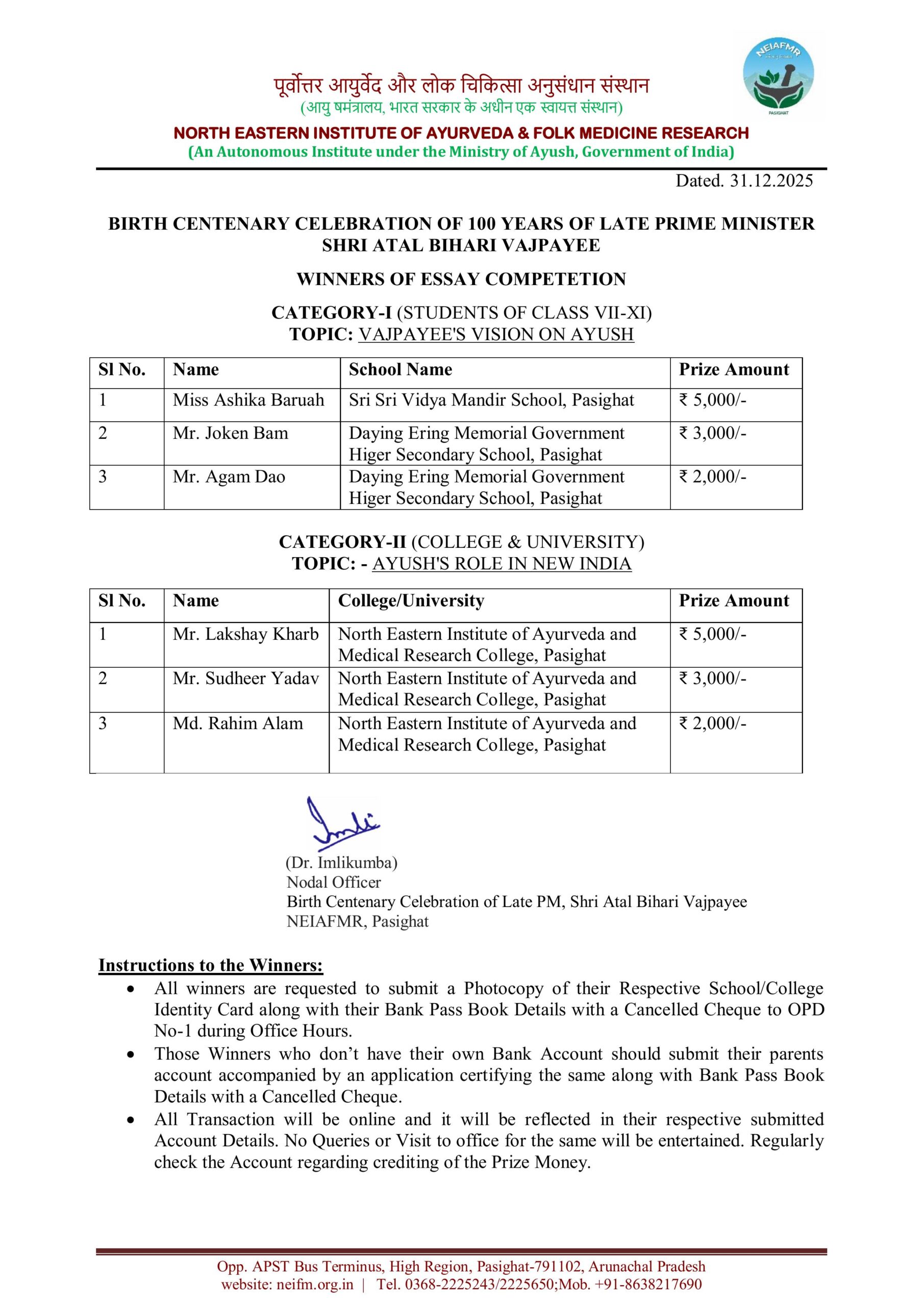 - Winners of Essay Competition on Birth Centenary Celebration of 100 Years of Late Prime Minister Shri Atal Bihari Vajpayee